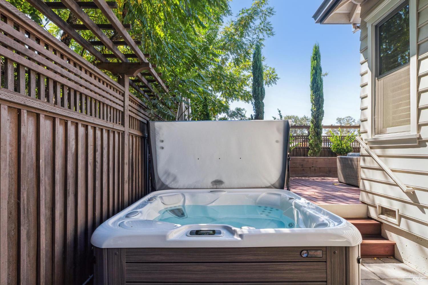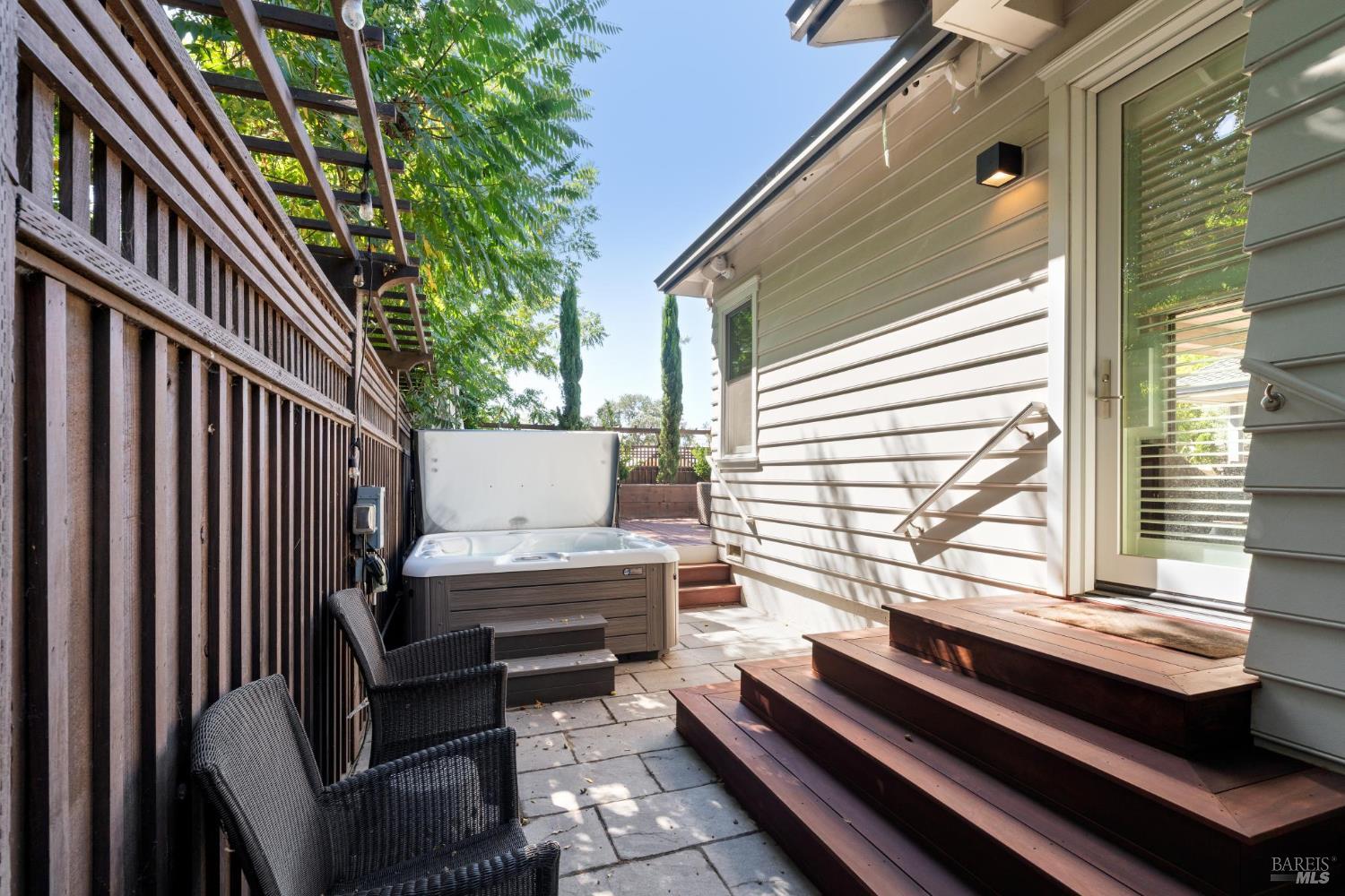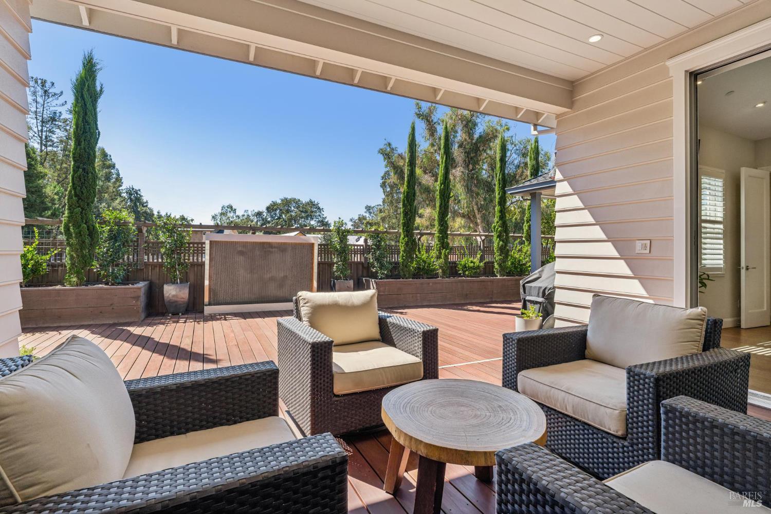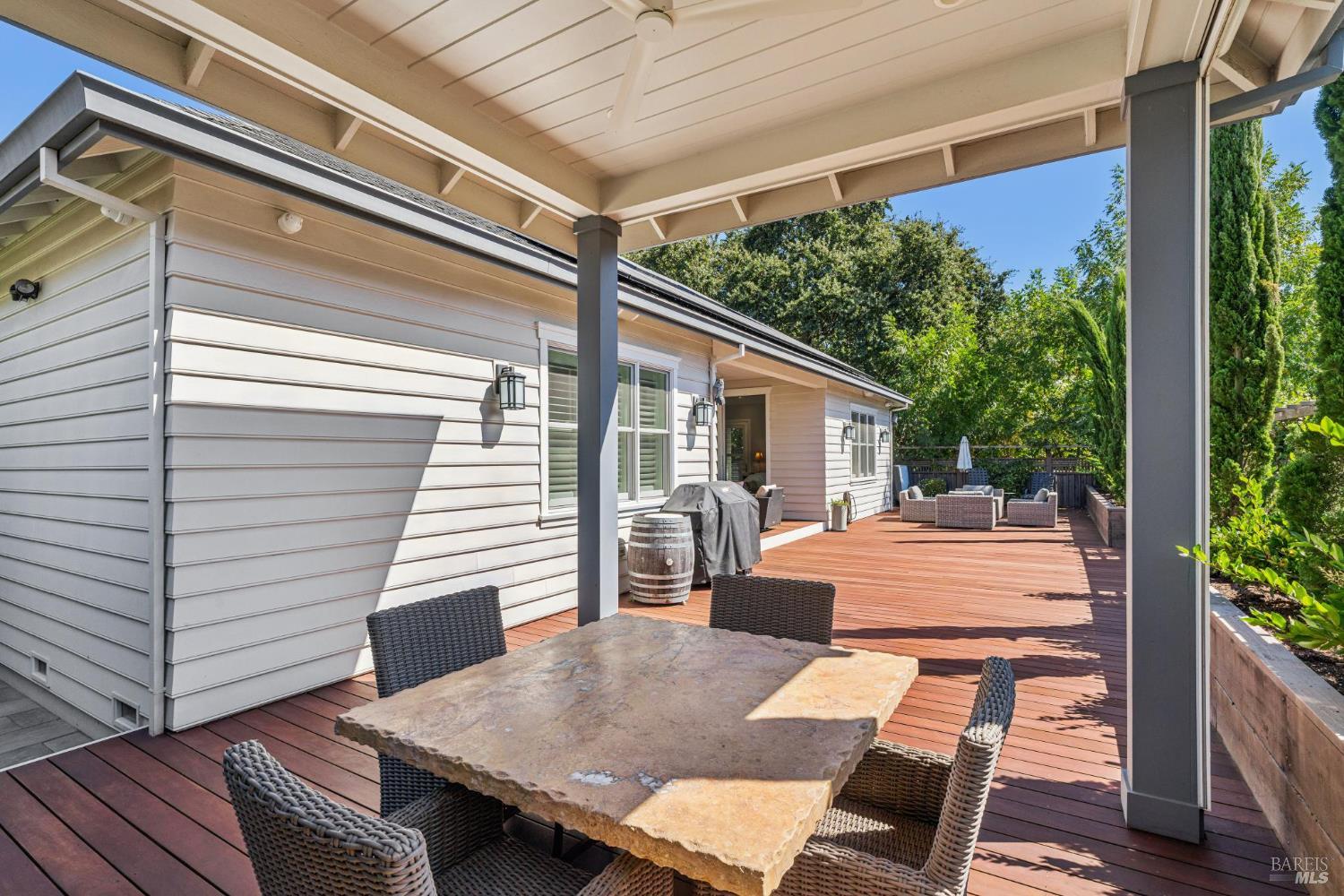 Located on Sonoma's east side, this exceptional property offers unparalleled access to wine country's premier shops, tasting rooms, wineries, and acclaimed restaurants. Nestled down a private lane, the 2,578 sq ft home combines luxurious interior features with stunning outdoor living. Inside, the residence boasts three spacious en-suite bedrooms, hardwood floors, and designer finishes throughout. The chef's kitchen is equipped with quartz countertops, stainless steel appliances, wine refrigeration, and butler pantry perfect for entertaining. Cathedral ceilings and Nano doors open to a wrap-around deck with a serene water feature, blending indoor comfort with outdoor elegance. The exterior dining area includes remote-controlled auto screens, providing shade for outdoor gatherings. The primary bedroom with en-suite bath offers a walk-in closet, jetted tub, and steam shower, with radiant heat in the bathroom floors. Natural light floods the space through plantation shutters and sliding doors leading to the private hot tub. The front porch is beautifully landscaped, with seasonal blooms and professional design creating a welcoming curb appeal. The abundance of space and style effortlessly blend making this home a true entertainer's paradise.