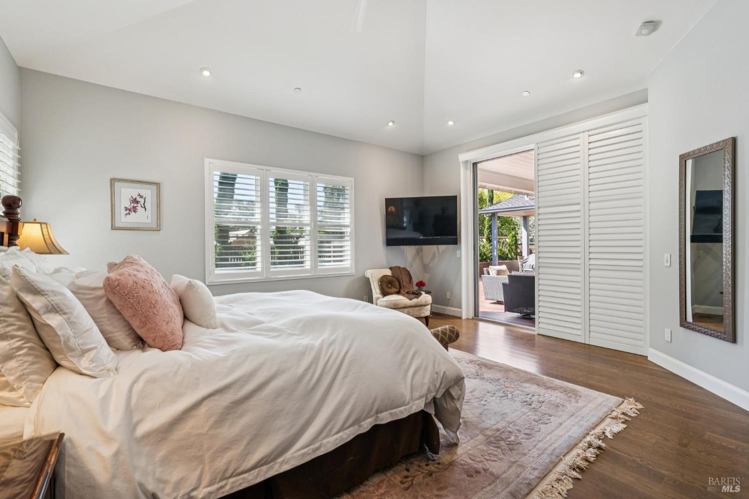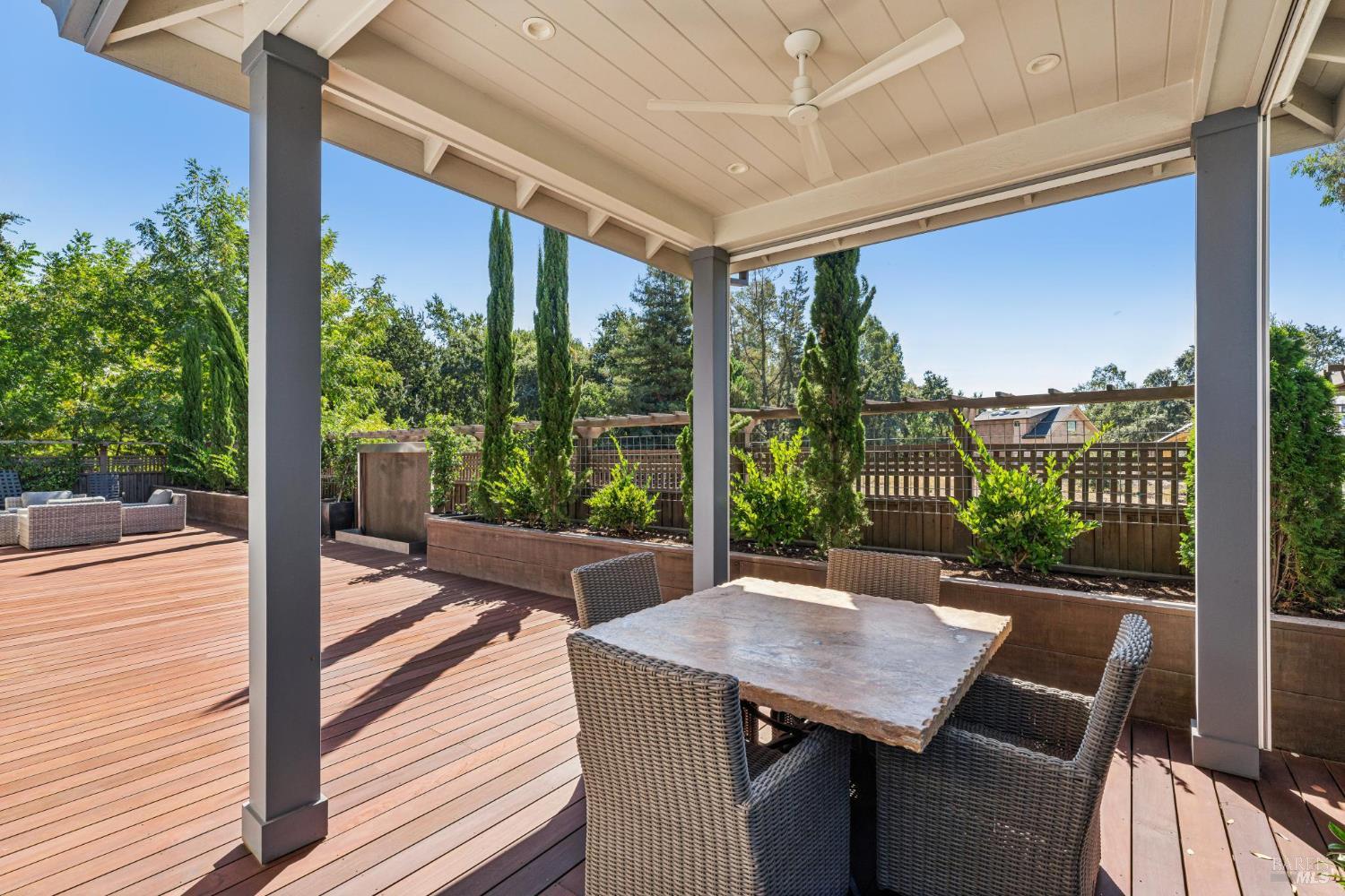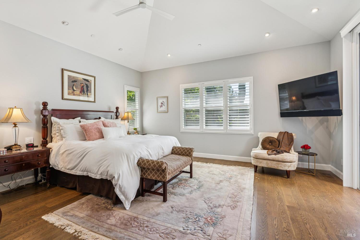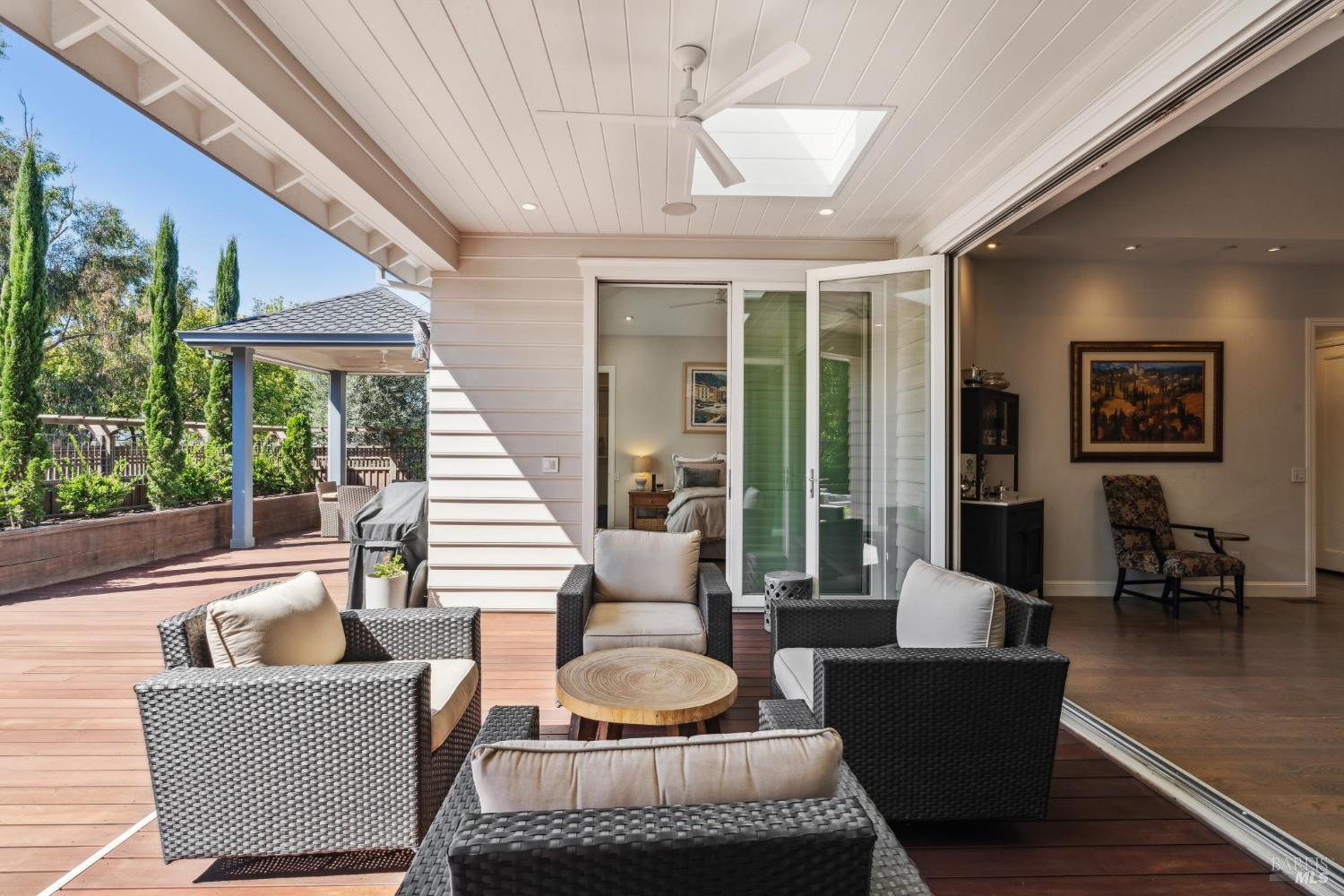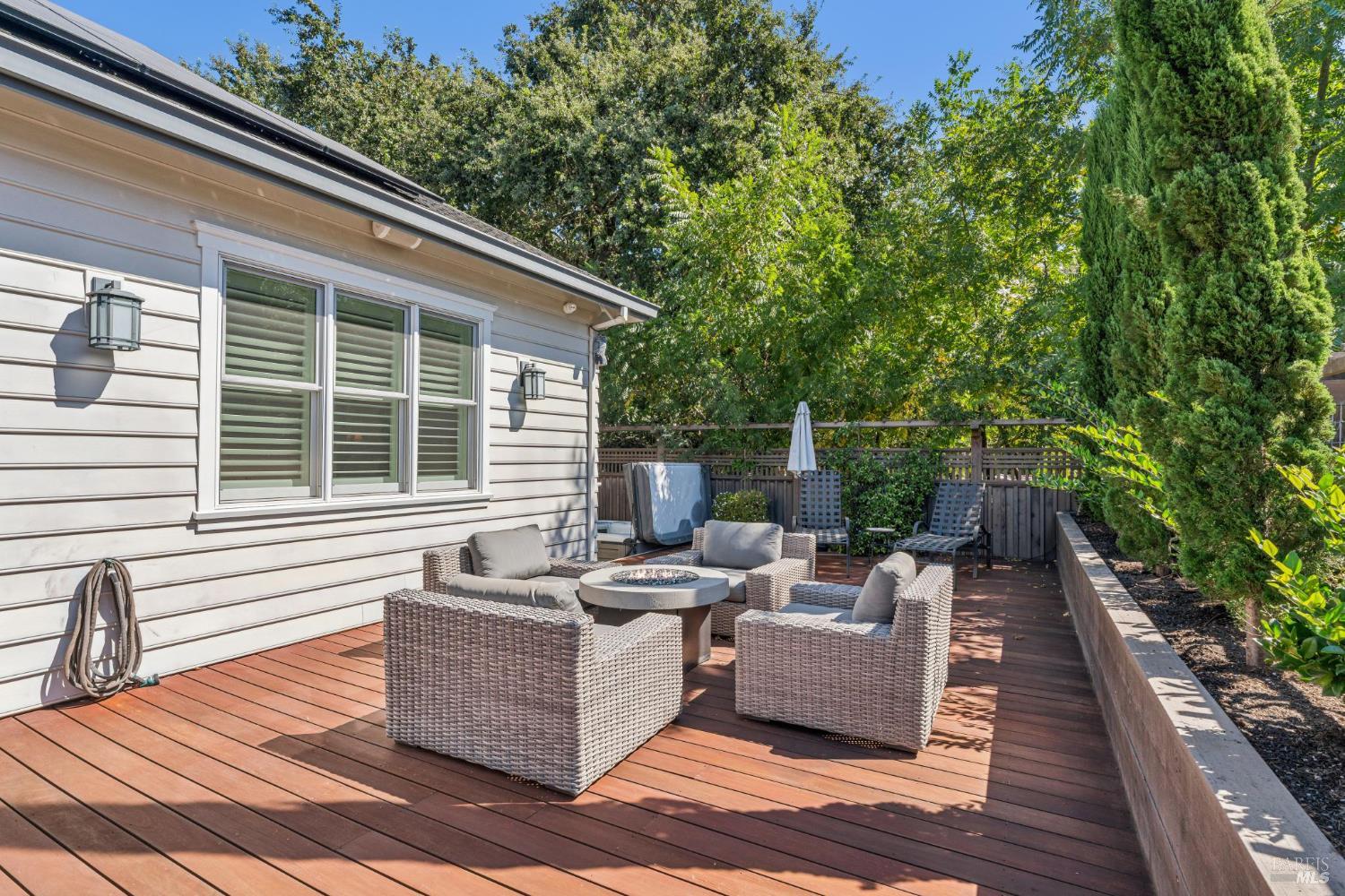 Located on Sonoma's east side, this exceptional property offers unparalleled access to wine country's premier shops, tasting rooms, wineries, and acclaimed restaurants. Nestled down a private lane, the 2,578 sq ft home combines luxurious interior features with stunning outdoor living. Inside, the residence boasts three spacious en-suite bedrooms, hardwood floors, and designer finishes throughout. The chef's kitchen is equipped with quartz countertops, stainless steel appliances, wine refrigeration, and butler pantry perfect for entertaining. Cathedral ceilings and Nano doors open to a wrap-around deck with a serene water feature, blending indoor comfort with outdoor elegance. The exterior dining area includes remote-controlled auto screens, providing shade for outdoor gatherings. The primary bedroom with en-suite bath offers a walk-in closet, jetted tub, and steam shower, with radiant heat in the bathroom floors. Natural light floods the space through plantation shutters and sliding doors leading to the private hot tub. The front porch is beautifully landscaped, with seasonal blooms and professional design creating a welcoming curb appeal. The abundance of space and style effortlessly blend making this home a true entertainer's paradise.