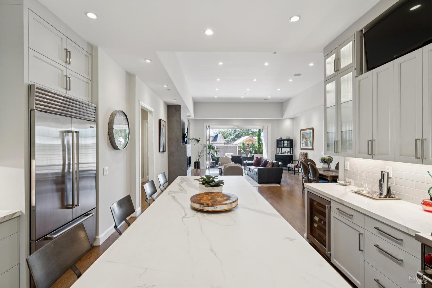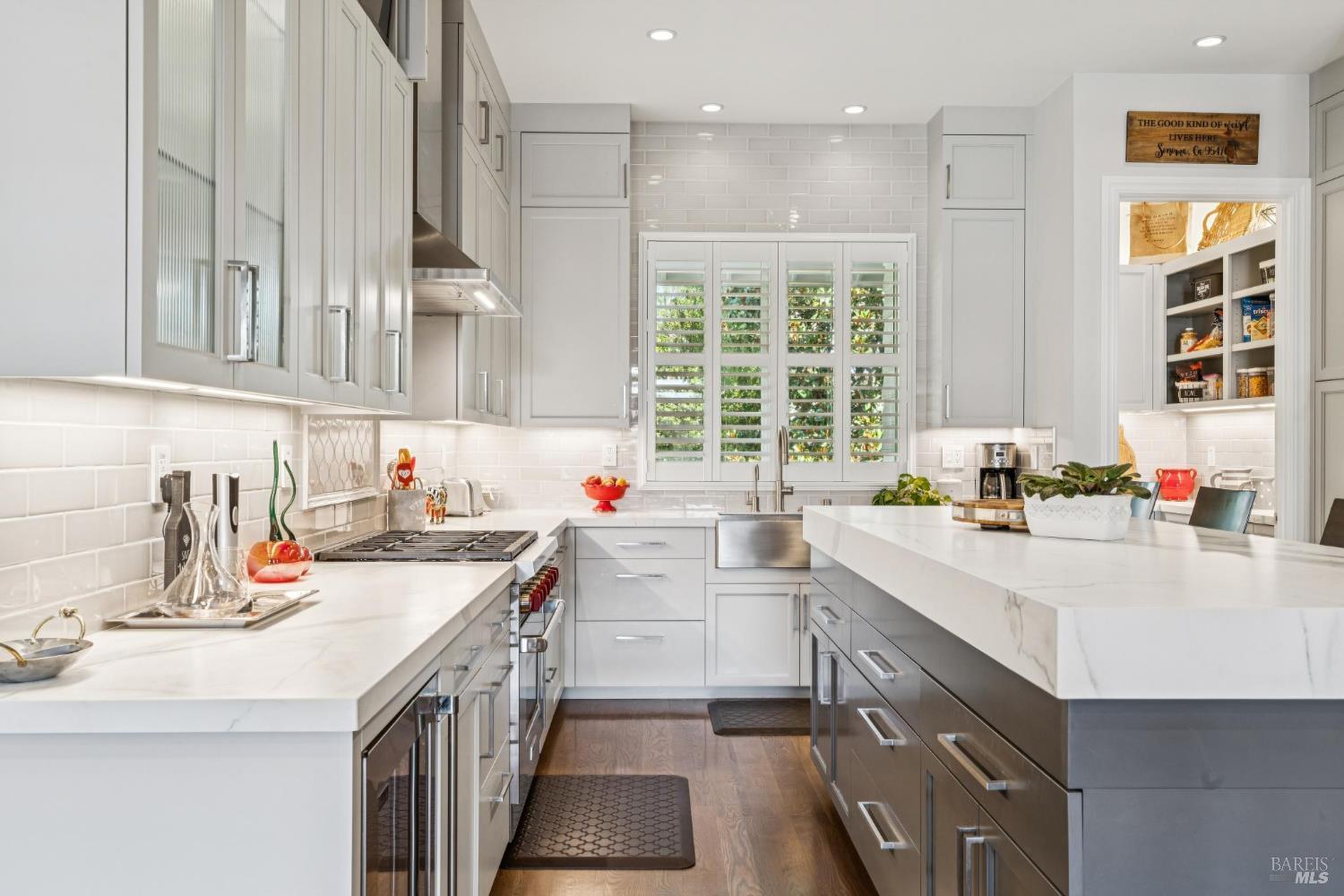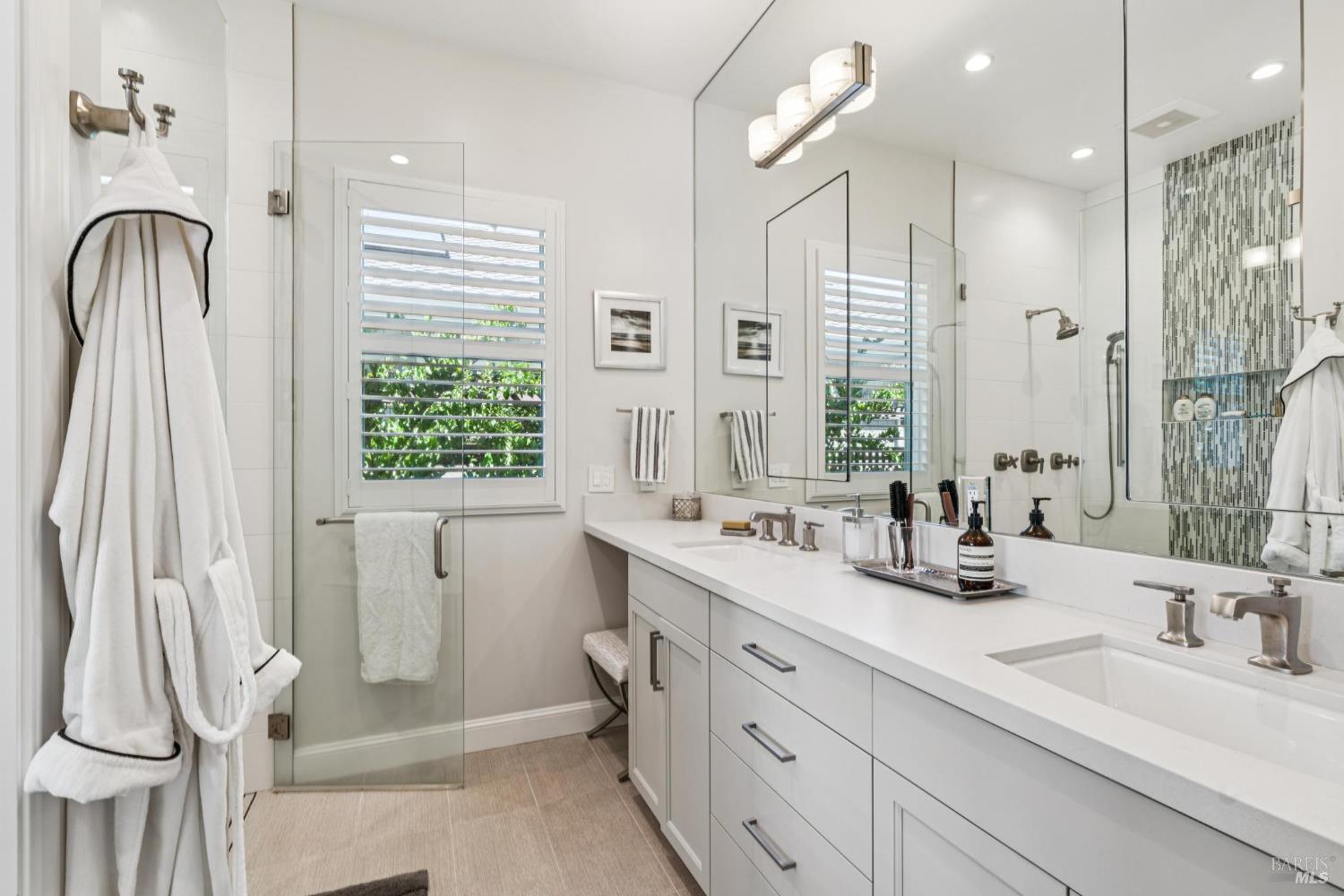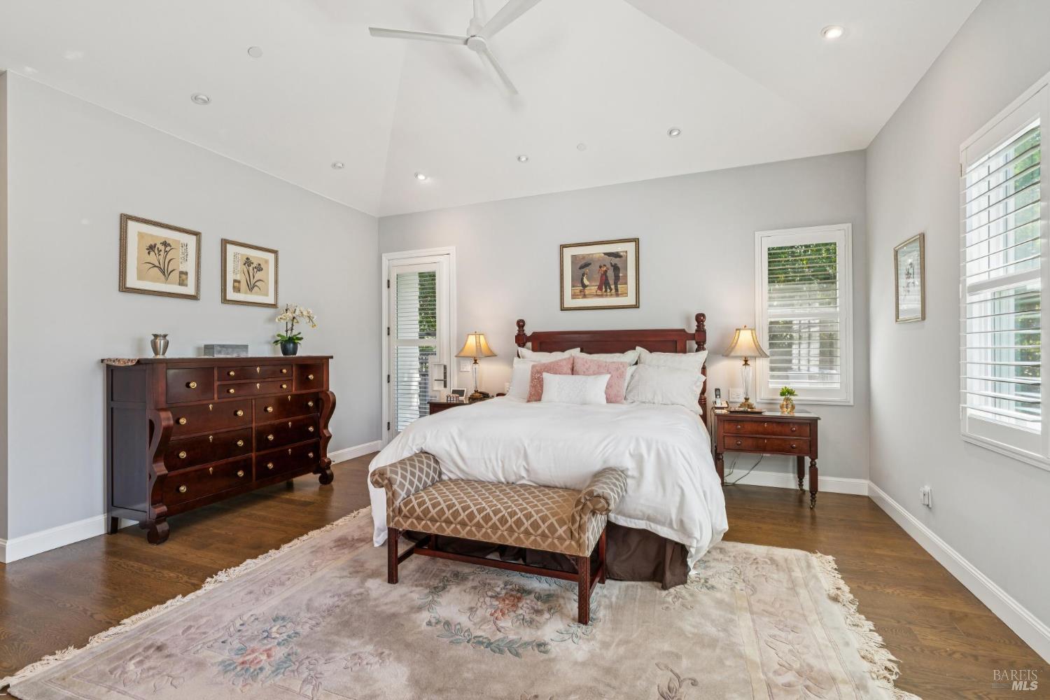 Located on Sonoma's east side, this exceptional property offers unparalleled access to wine country's premier shops, tasting rooms, wineries, and acclaimed restaurants. Nestled down a private lane, the 2,578 sq ft home combines luxurious interior features with stunning outdoor living. Inside, the residence boasts three spacious en-suite bedrooms, hardwood floors, and designer finishes throughout. The chef's kitchen is equipped with quartz countertops, stainless steel appliances, wine refrigeration, and butler pantry perfect for entertaining. Cathedral ceilings and Nano doors open to a wrap-around deck with a serene water feature, blending indoor comfort with outdoor elegance. The exterior dining area includes remote-controlled auto screens, providing shade for outdoor gatherings. The primary bedroom with en-suite bath offers a walk-in closet, jetted tub, and steam shower, with radiant heat in the bathroom floors. Natural light floods the space through plantation shutters and sliding doors leading to the private hot tub. The front porch is beautifully landscaped, with seasonal blooms and professional design creating a welcoming curb appeal. The abundance of space and style effortlessly blend making this home a true entertainer's paradise.
