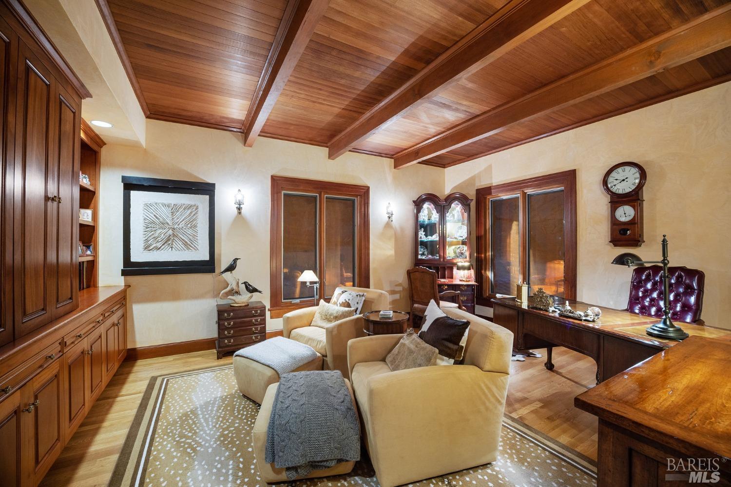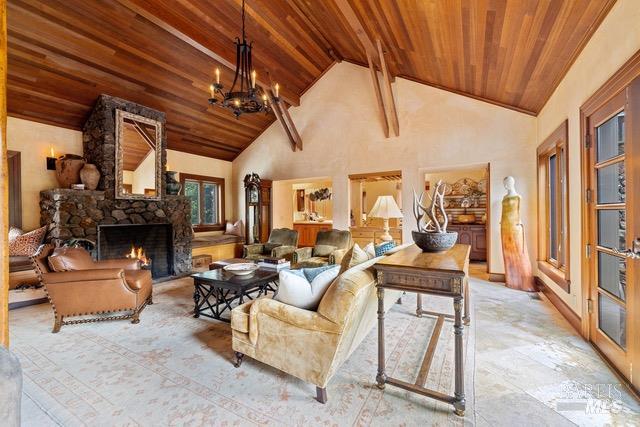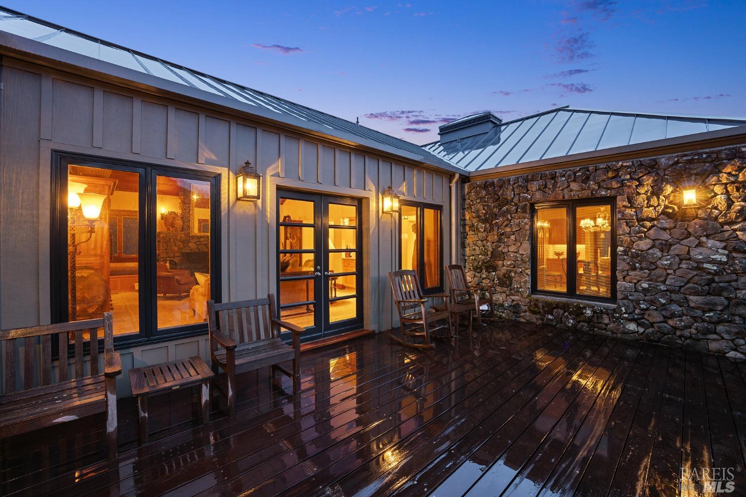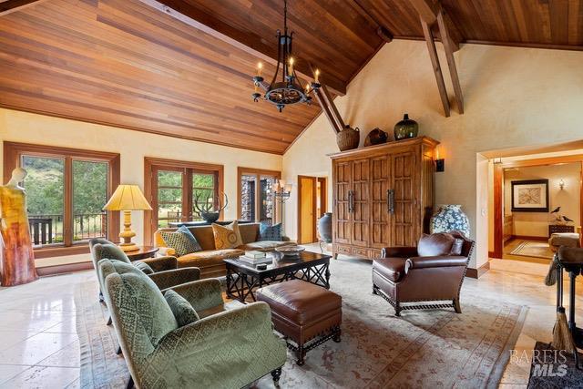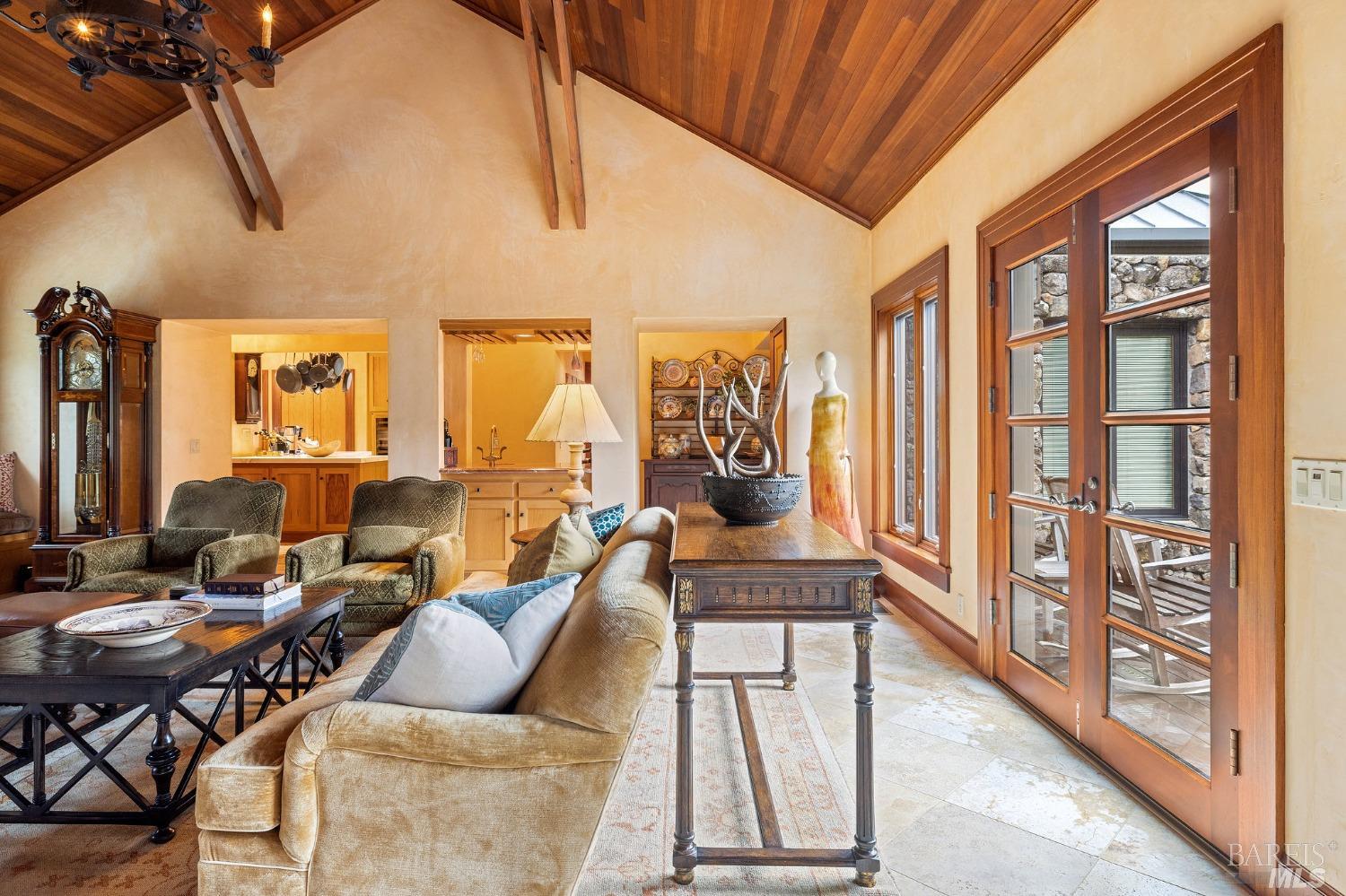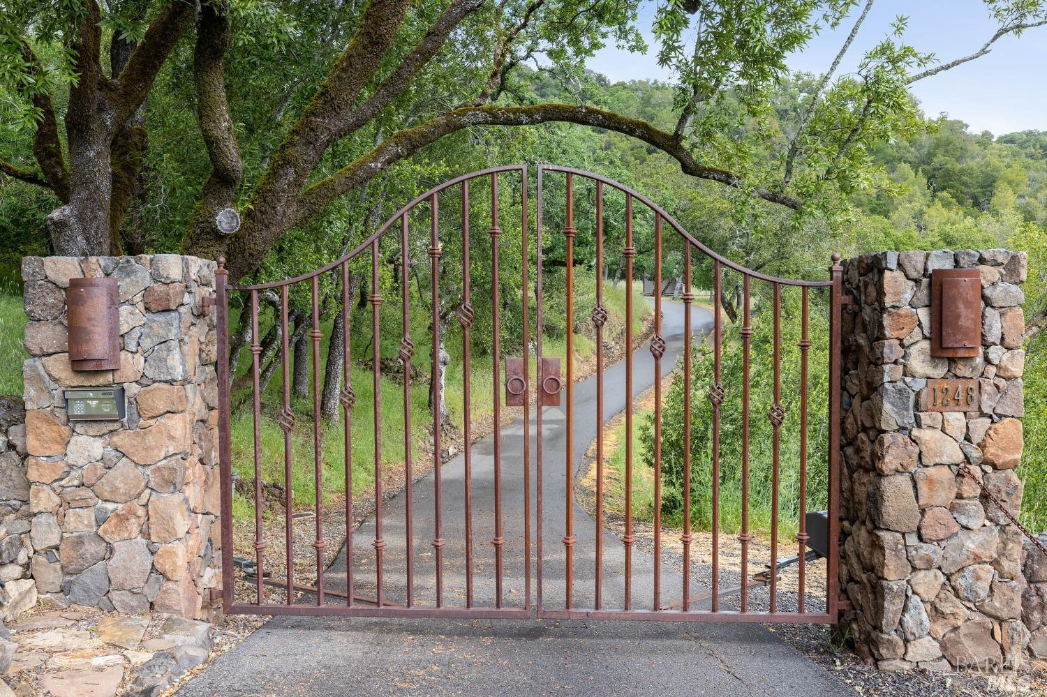 Classically designed, traditionally styled, & immaculately maintained one of a kind Wine Country Estate designed by famed architect Jim Gillam, partner of Howard Backen. Situated on over 15 acres of secluded lands w/sweeping views, majestic Oaks, open meadows, & rolling hills. Complete privacy w/double gated entry in The Ranch, yet less than 10 minutes to the historic Plaza. Tastefully remodeled with the highest quality finishes & every detail is perfection. Understated sophisticated elegance at its best. Interior features include first floor primary, open beam & cathedral ceilings throughout, custom cabinetry, dramatic double height stone fireplace, & picture perfect views from every window. Chef's kitchen w/Viking appliances, two wine refrigerators, custom cabinetry, & exotic stone & woods. Generous size primary bedroom w/the most spectacular custom closet design. Elegant & understated primary bath w/high end finishes. Sonoma fieldstone construction w/Zinc metal roof, antique iron work details, stone walls & popular U-shaped layout creating a large back patio accessed by the entire main level. 100 full redundant power generator that runs on LP, 5 ton variable speed heating & A/C. Loft above garage. Workshop in garage. Room for pool, more outbuildings, etc. Garden shed.