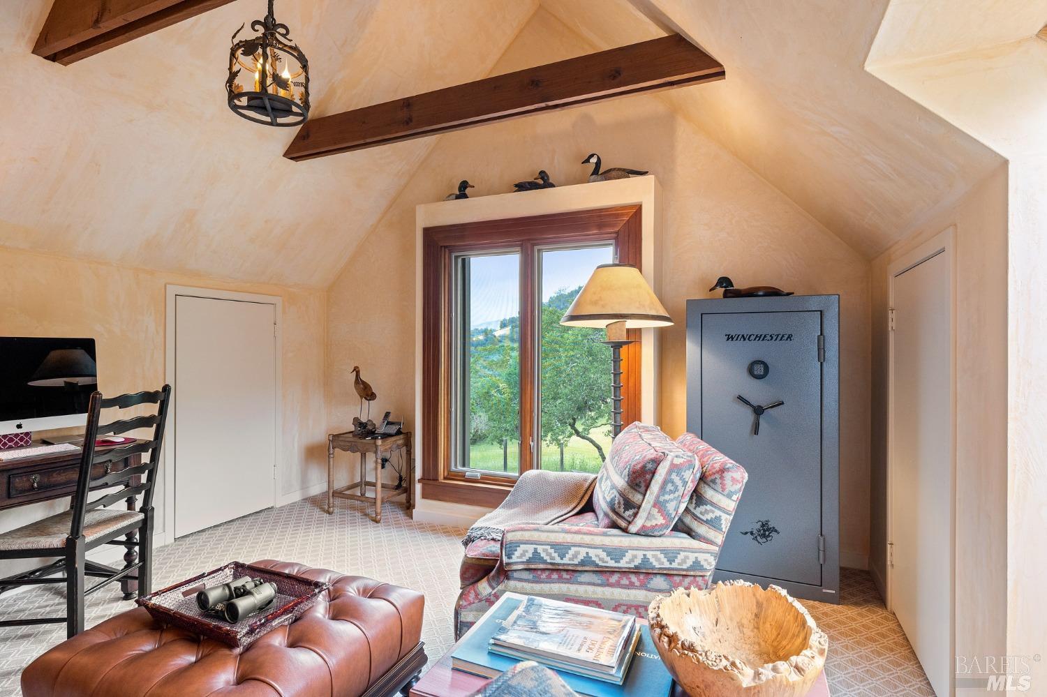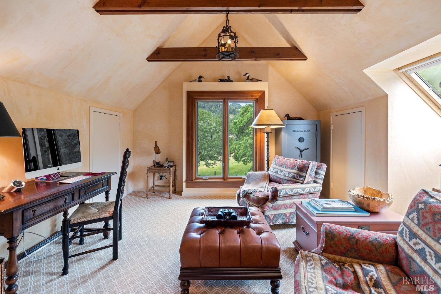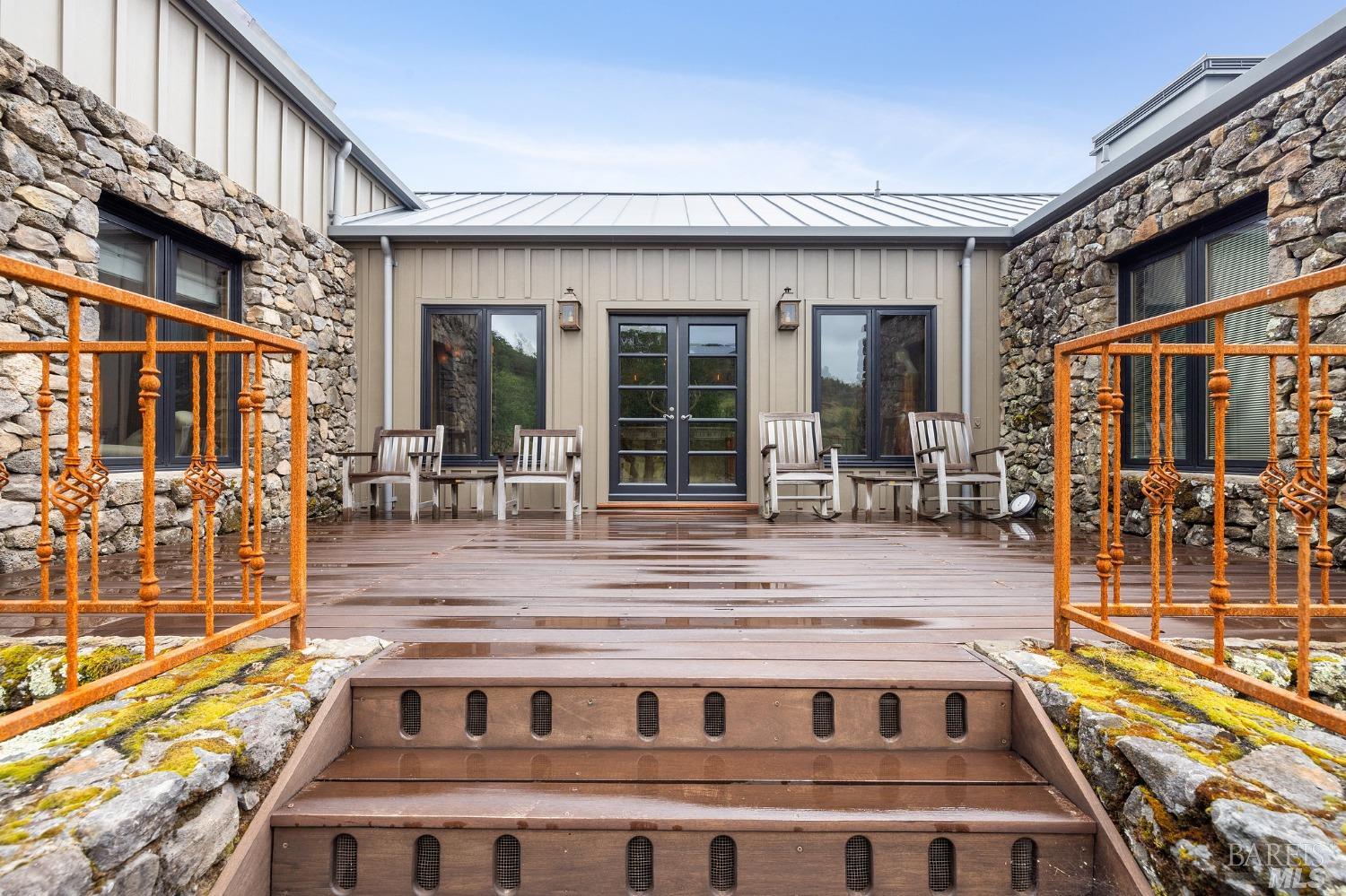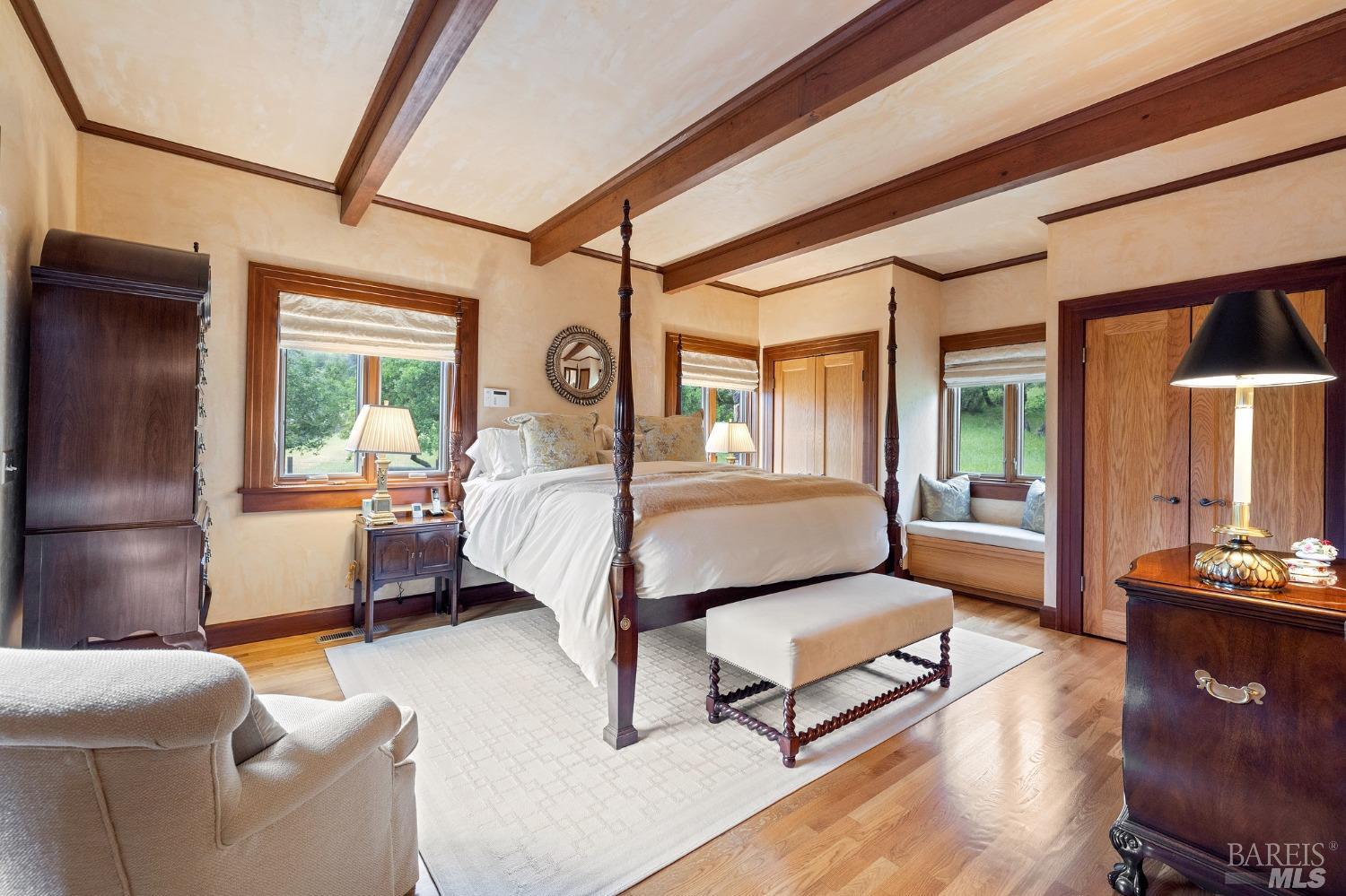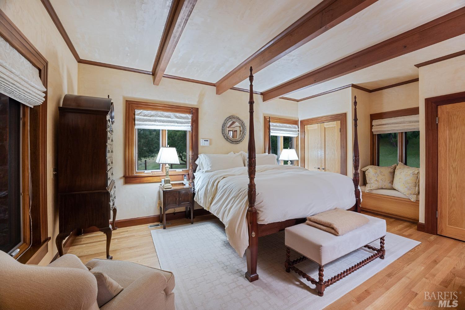 Classically designed, traditionally styled, & immaculately maintained one of a kind Wine Country Estate designed by famed architect Jim Gillam, partner of Howard Backen. Situated on over 15 acres of secluded lands w/sweeping views, majestic Oaks, open meadows, & rolling hills. Complete privacy w/double gated entry in The Ranch, yet less than 10 minutes to the historic Plaza. Tastefully remodeled with the highest quality finishes & every detail is perfection. Understated sophisticated elegance at its best. Interior features include first floor primary, open beam & cathedral ceilings throughout, custom cabinetry, dramatic double height stone fireplace, & picture perfect views from every window. Chef's kitchen w/Viking appliances, two wine refrigerators, custom cabinetry, & exotic stone & woods. Generous size primary bedroom w/the most spectacular custom closet design. Elegant & understated primary bath w/high end finishes. Sonoma fieldstone construction w/Zinc metal roof, antique iron work details, stone walls & popular U-shaped layout creating a large back patio accessed by the entire main level. 100 full redundant power generator that runs on LP, 5 ton variable speed heating & A/C. Loft above garage. Workshop in garage. Room for pool, more outbuildings, etc. Garden shed.