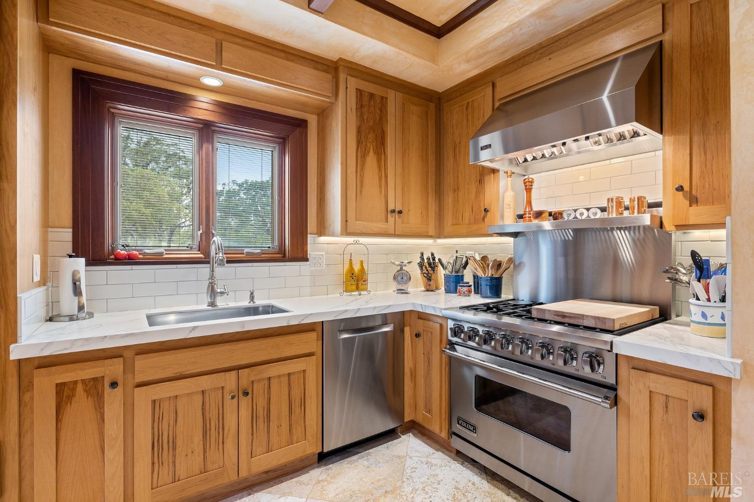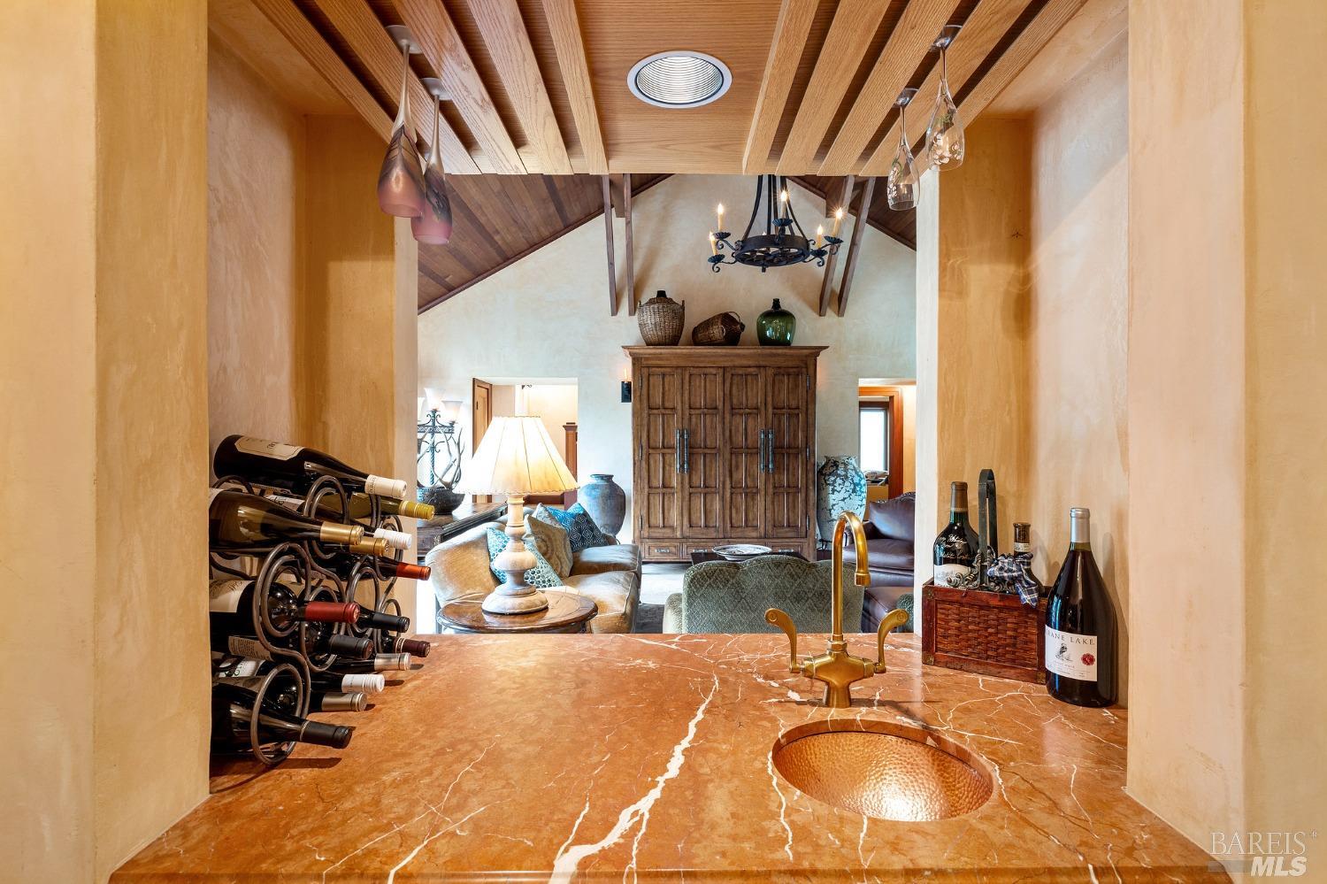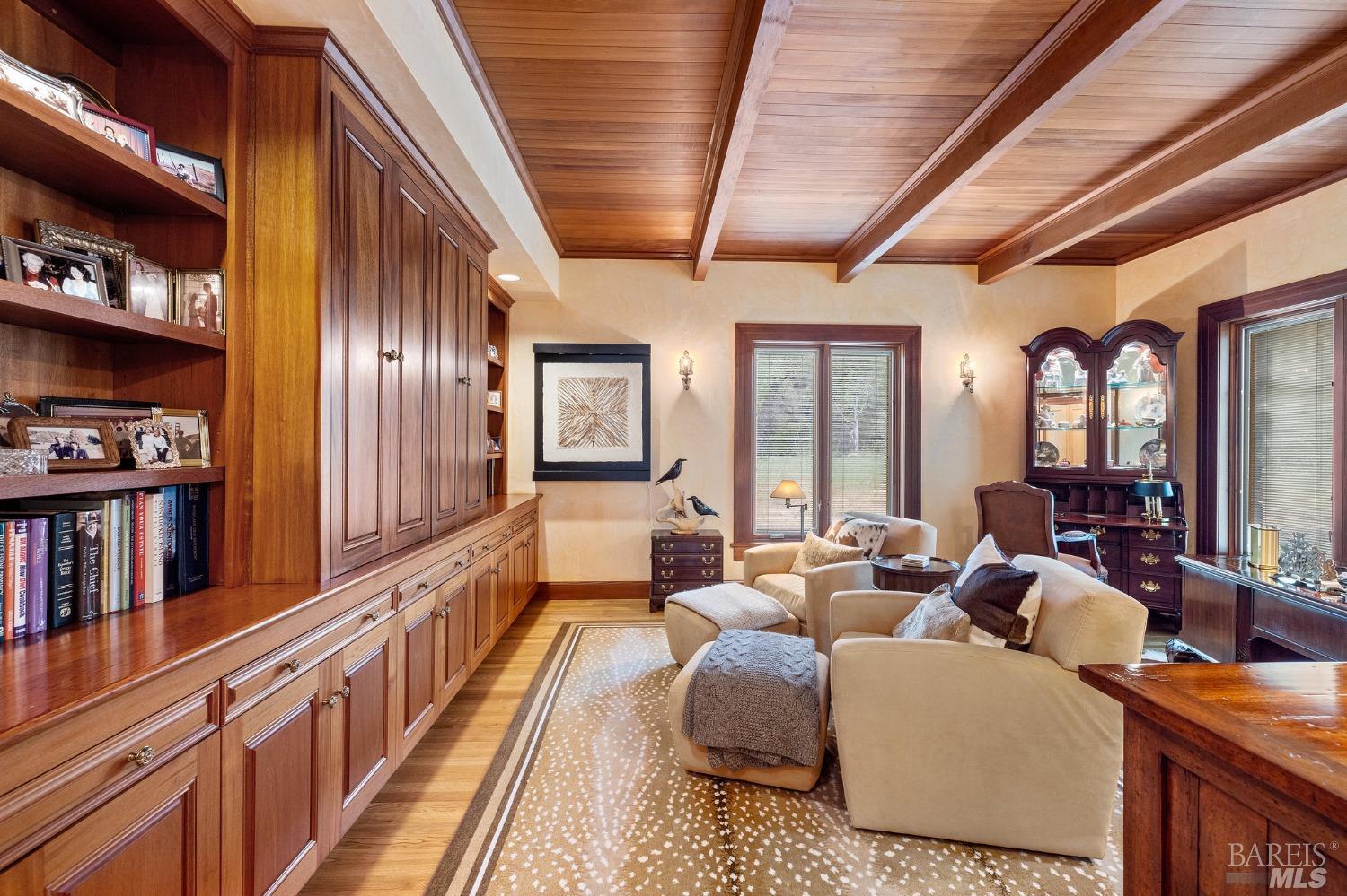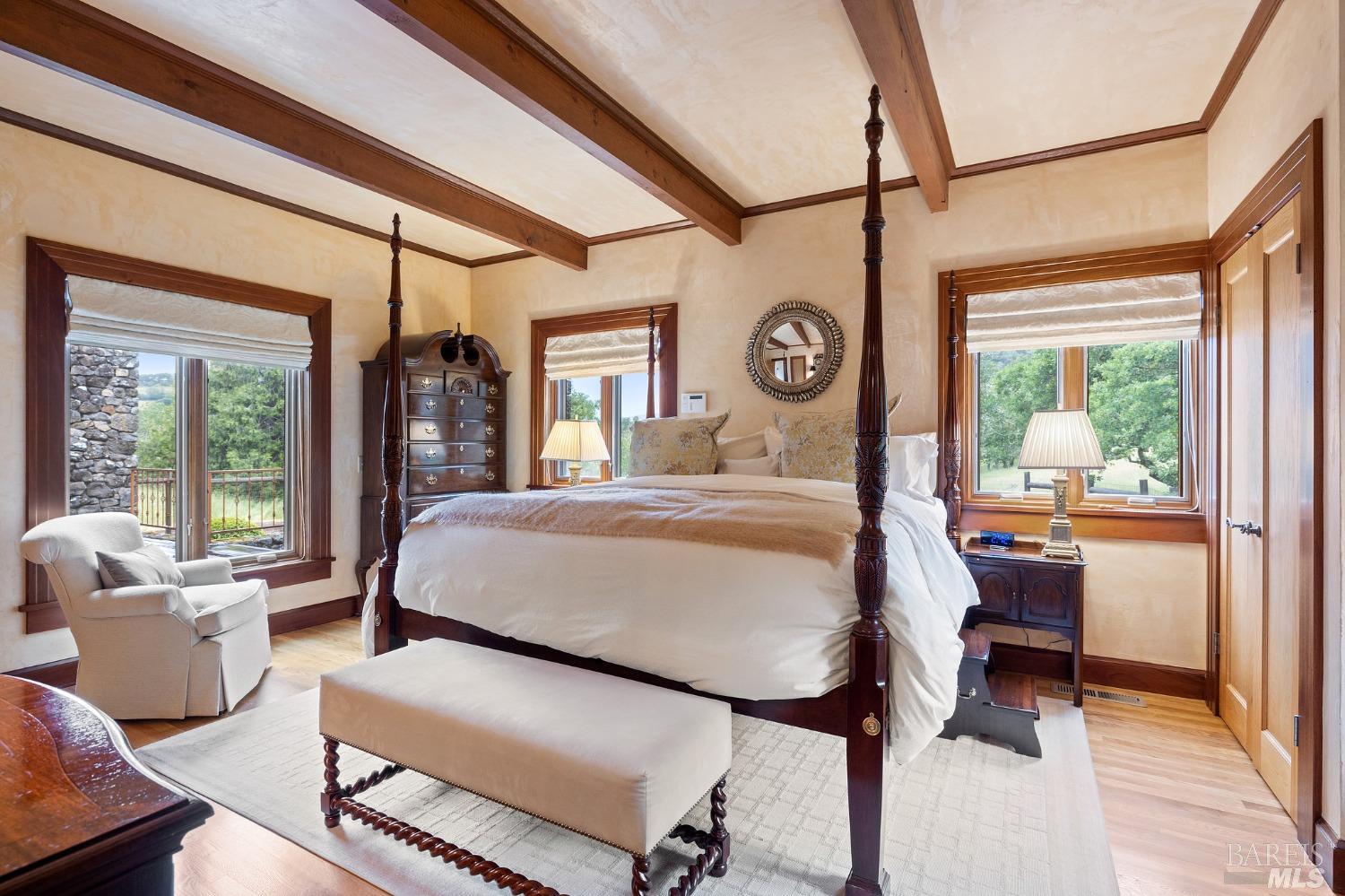 Classically designed, traditionally styled, & immaculately maintained one of a kind Wine Country Estate designed by famed architect Jim Gillam, partner of Howard Backen. Situated on over 15 acres of secluded lands w/sweeping views, majestic Oaks, open meadows, & rolling hills. Complete privacy w/double gated entry in The Ranch, yet less than 10 minutes to the historic Plaza. Tastefully remodeled with the highest quality finishes & every detail is perfection. Understated sophisticated elegance at its best. Interior features include first floor primary, open beam & cathedral ceilings throughout, custom cabinetry, dramatic double height stone fireplace, & picture perfect views from every window. Chef's kitchen w/Viking appliances, two wine refrigerators, custom cabinetry, & exotic stone & woods. Generous size primary bedroom w/the most spectacular custom closet design. Elegant & understated primary bath w/high end finishes. Sonoma fieldstone construction w/Zinc metal roof, antique iron work details, stone walls & popular U-shaped layout creating a large back patio accessed by the entire main level. 100 full redundant power generator that runs on LP, 5 ton variable speed heating & A/C. Loft above garage. Workshop in garage. Room for pool, more outbuildings, etc. Garden shed.