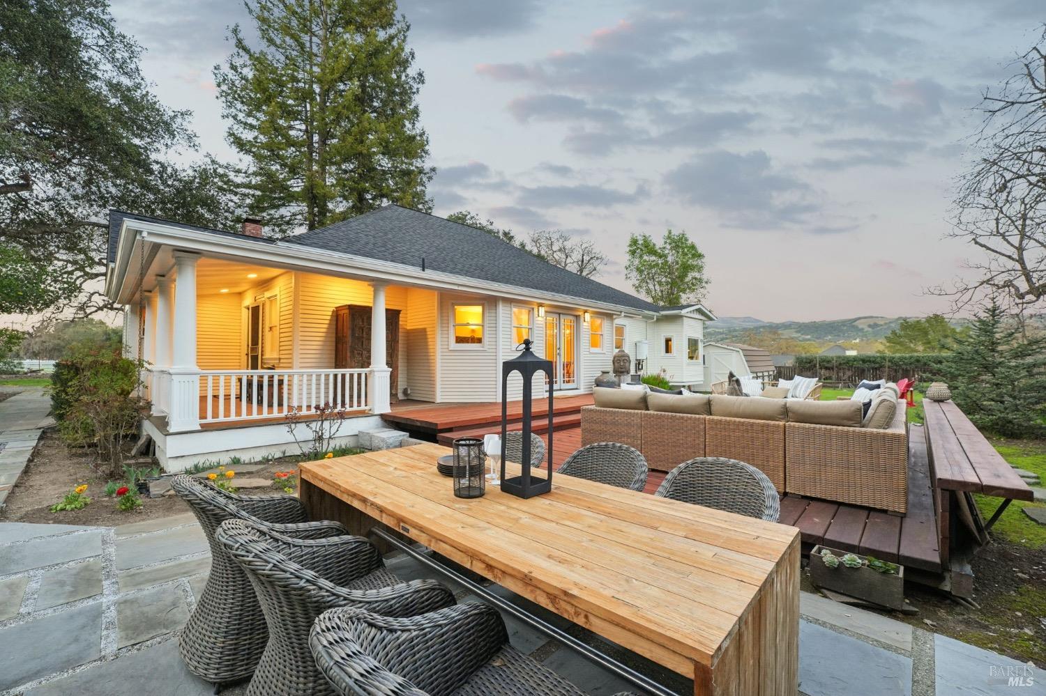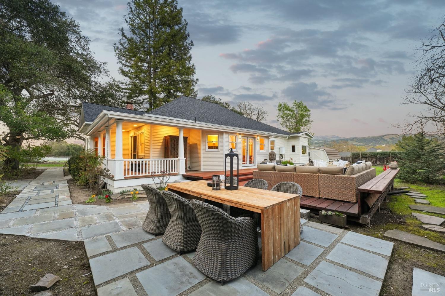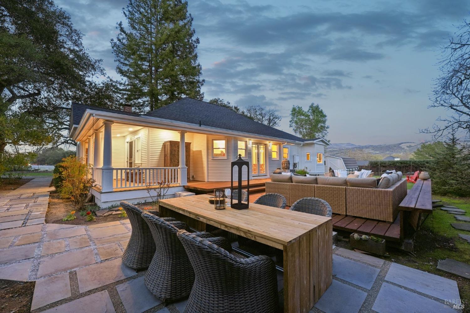 Charming Turn of the Century farmhouse situated on a large and private parcel of over 1 acre with postcard perfect panoramic views. Retaining period details such as leaded glass, wrap around covered front porch, and oversized mouldings while blending modern flair and edge, it has a timeless style that epitomizes the Sonoma Wine Country visual. Interior features include light stained wood floors, fireplace, high ceilings, updated finishes & mechanical systems, and wonderful indoor/outdoor flow. New roof, newer paint, newer bath, newer deck...a list so long you must see list of upgrades and you will see this property is ready for immediate enjoyment. Main house is a 3 bedroom/2 full bath plus attached to it is a 1 bedroom/1 full bath cottage. The oversized deck lives like a second living room under the stars. Wine collectors will love the oversized climate controlled 2,400 bottle wine cellar. The privacy of country living yet only a few minutes to both downtown Glen Ellen, downtown Sonoma, a number of regional parks & dedicated open spaces, and more than a handful of tasting rooms just a bike ride away. An absolute gem and what most buyers envision when they think of the ideal Wine Country Escape. Move right in and start enjoying from day one.