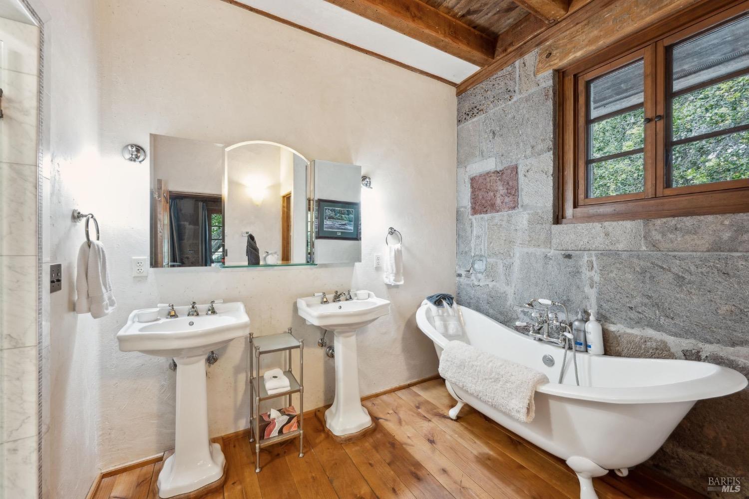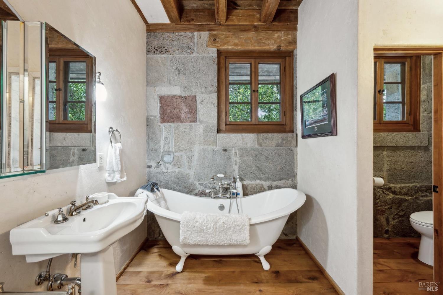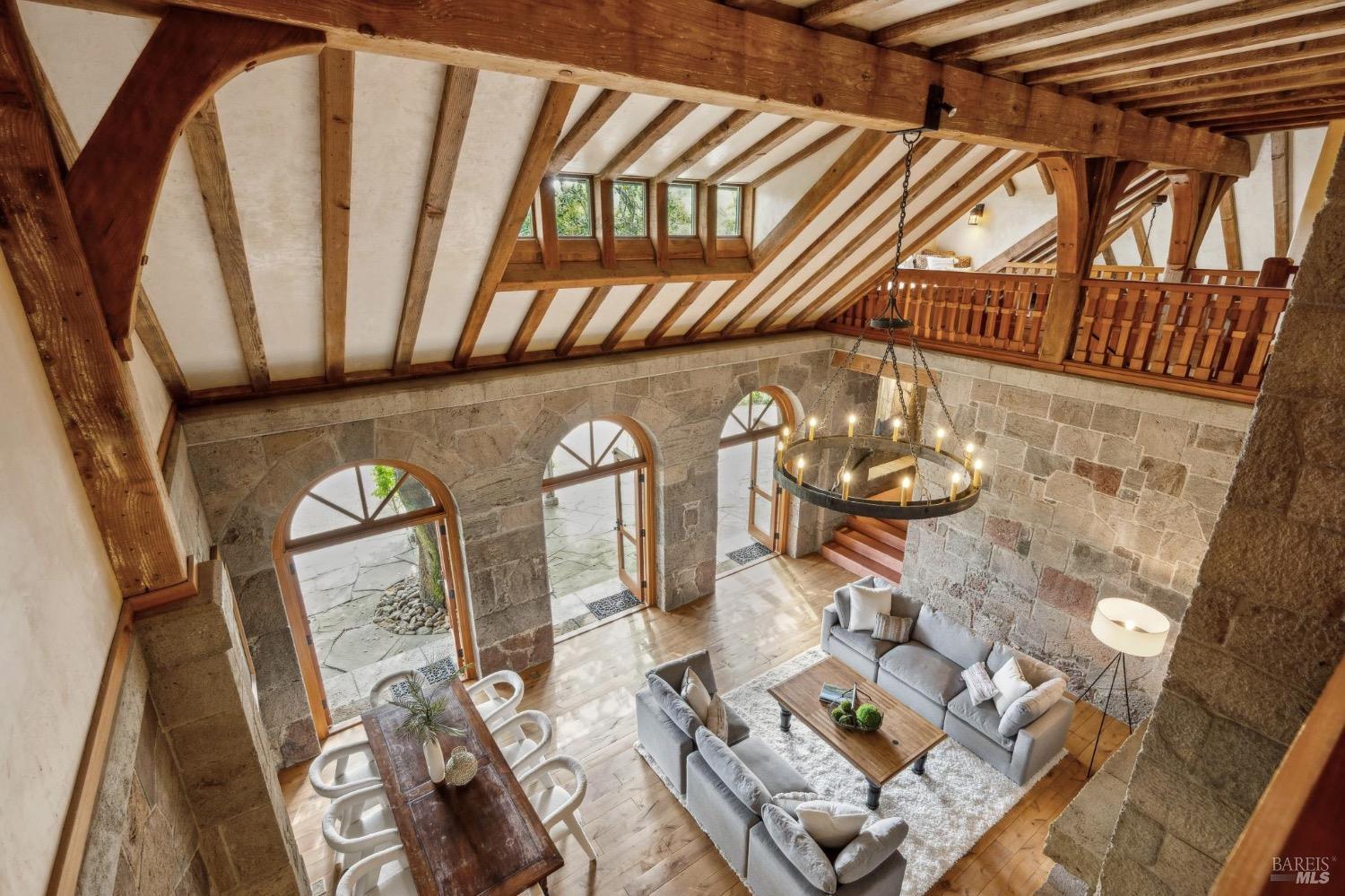 Once in a lifetime opportunity to be the next steward of one of Wine Country's finest estates. Complete privacy on nearly 200 acres of gently rolling hills w/award winning vines yet in a location that is just a bicycle ride to the historic Plaza. Picture perfect views in all directions w/rolling hillsides of terraced vines, towering Redwoods & majestic Oaks, and the SF skyline in the distance. The main residence, known as The Stone House, was handbuilt over a period of 3 decades by artisans from around the world & crafted w/hand chiseled stone sourced from the vineyards it overlooks. 4 en suite bedrooms, 22 foot high greatroom w/a series of French doors opening onto a wisteria graced trellis for dining al fresco. Enjoy sunshine by the oversized swimming pool & spa. Hike your own private wonderland & visit the multiple lakes & reservoirs. Invite the friends for a barn party or keep busy w/projects if you love to tinker. Bring your classic car or bike collection & enjoy a relaxing drive through the vines & out to the Coast. Your own resort is just 45 minutes north of the Golden Gate. Become a wine connoisseur & gift your friends some of your own wine or let a wine maker deal with it & just work on relaxing. Additional charming cottage overlooking lake for even more guests.