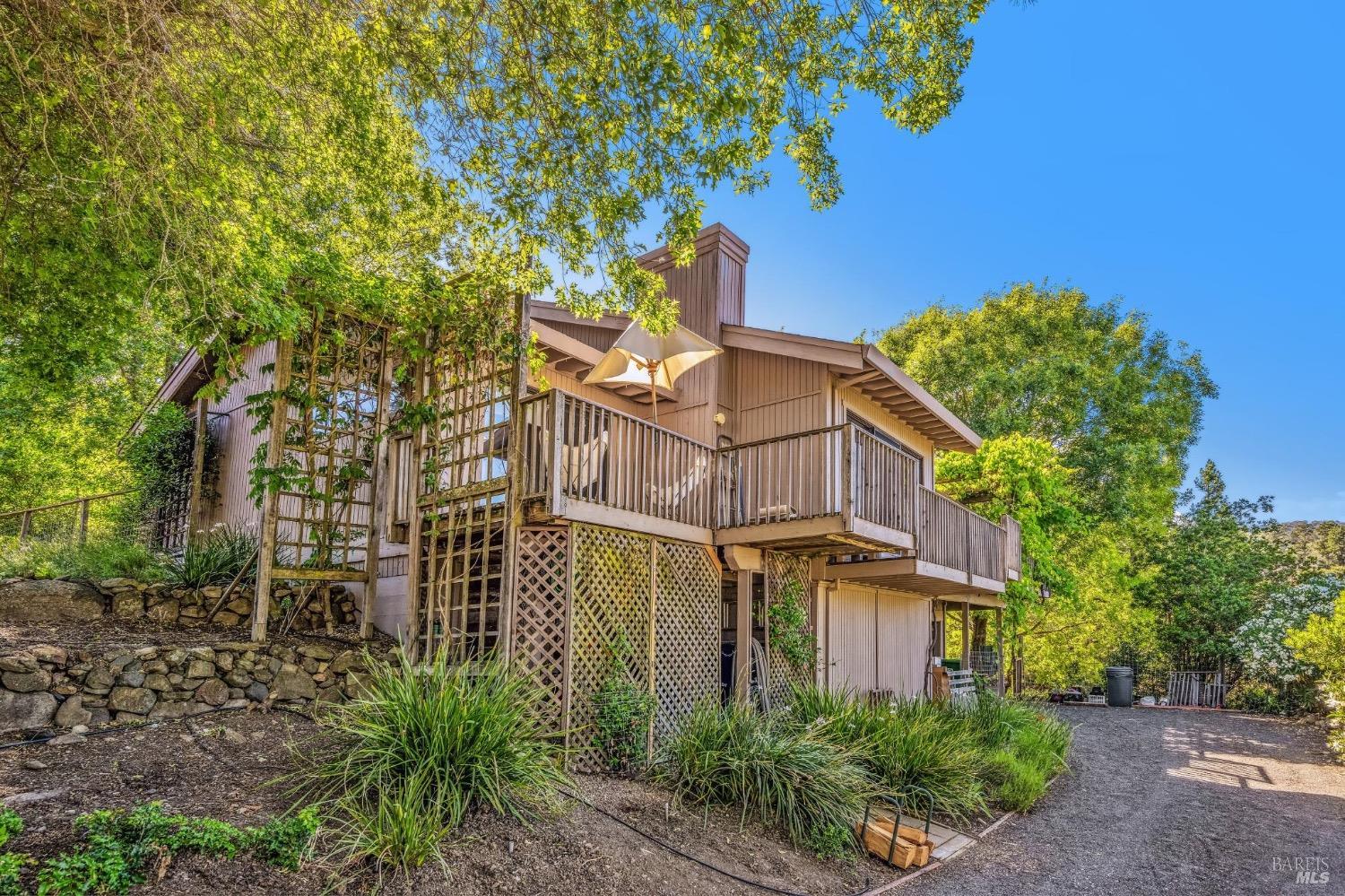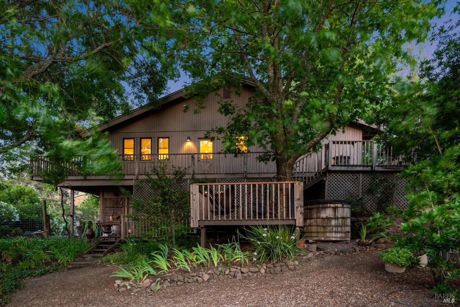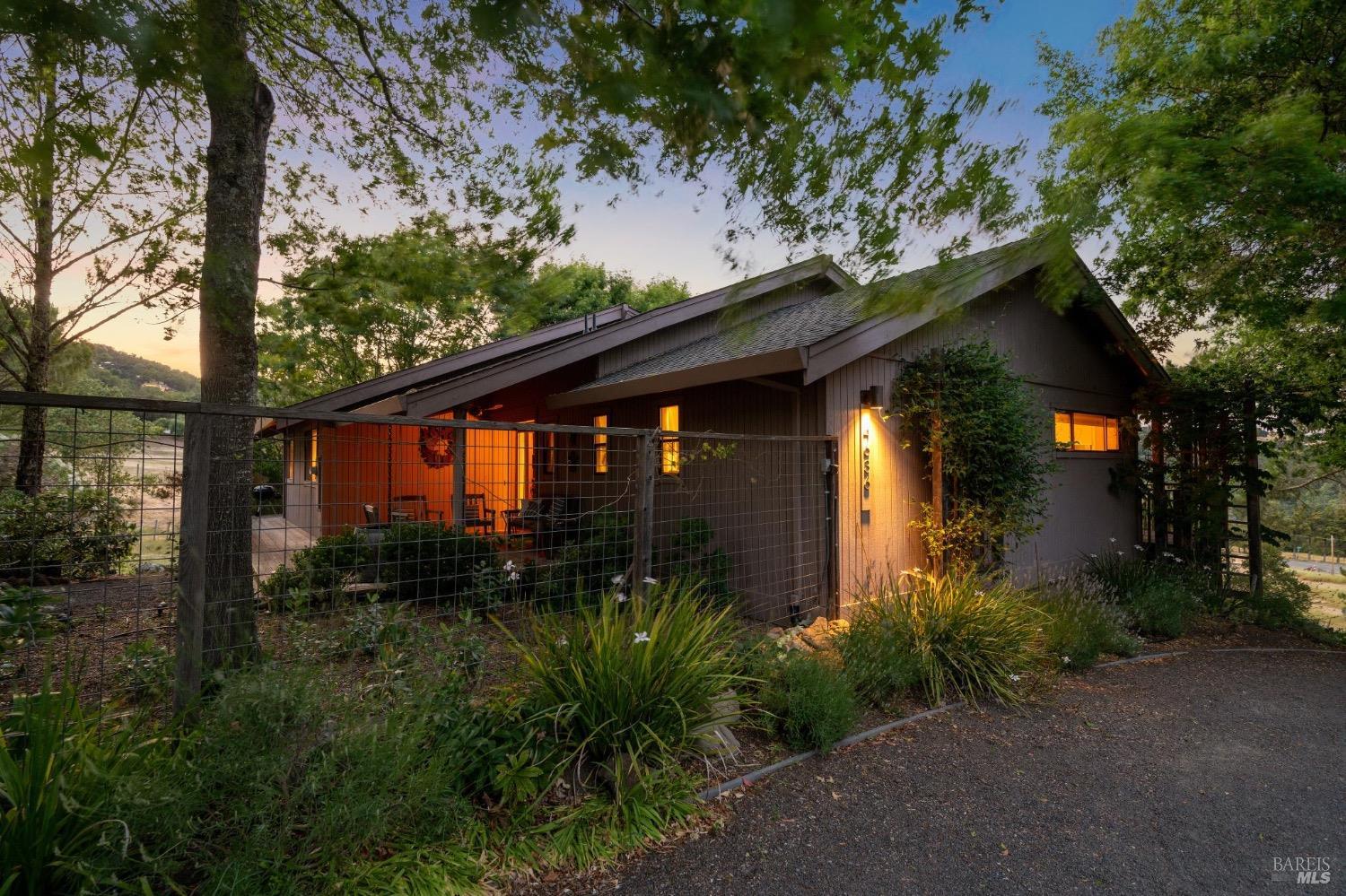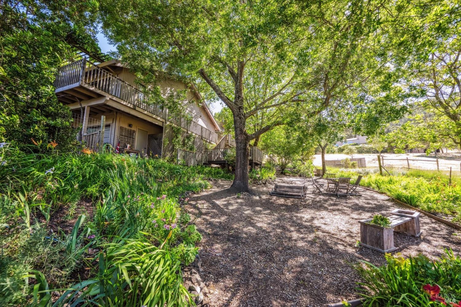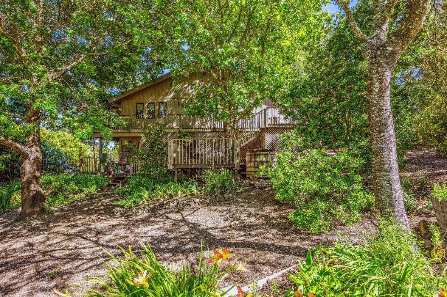Sweeping views of the rolling hills, open meadows, ridge lines, and vineyards in the distance. Solitude and privacy yet a short drive to the historic Plaza. Located in the desirable Diamond A Ranch Estates, this 3 bedroom/2 bath home has been lovingly updated and boasts an open floorplan, cathedral ceilings, fireplace, walls of glass, and incredible natural light. Indoor/outdoor living at its best with oversized sliders leading to an inviting deck with the views beyond. Enter through a quaint garden with mature landscaping, shade trees & flowers of all types bursting with color. Nearly 1.5 acres. Low maintenance grounds that are lush & inviting. Sit back and take in the peace, quiet, nature, and views. Hot tub under a canopy of trees. The Diamond A Recreation Center has a voluntary membership that has recently refinished pickle ball/tennis courts, pool, baseball diamond, and club house. It is the hub of activity for this inviting and close knit community. Surrounded by larger & more expensive homes so the upside is incredible for this wonderful home. We all love the idea of extra storage and boy do we have storage at this home. Lives like a single story since everything is on the main level at street level other than garage. Tons of storage on the lower level.