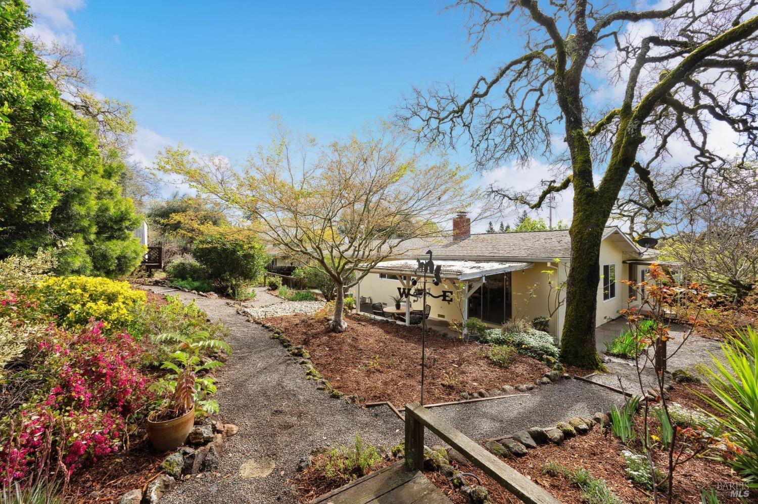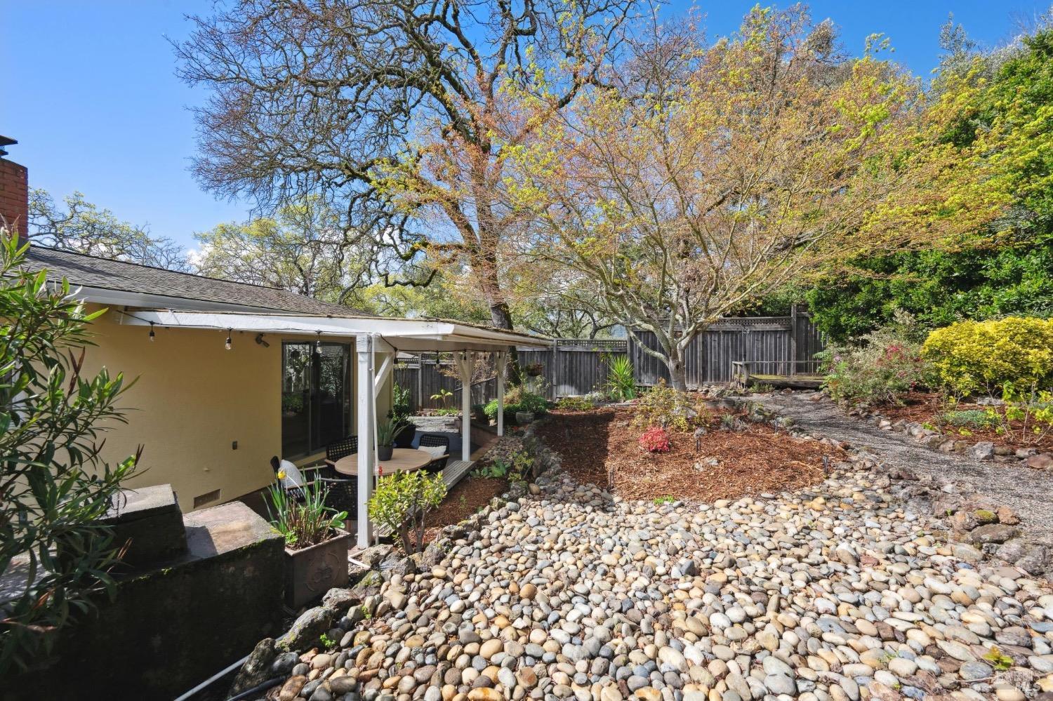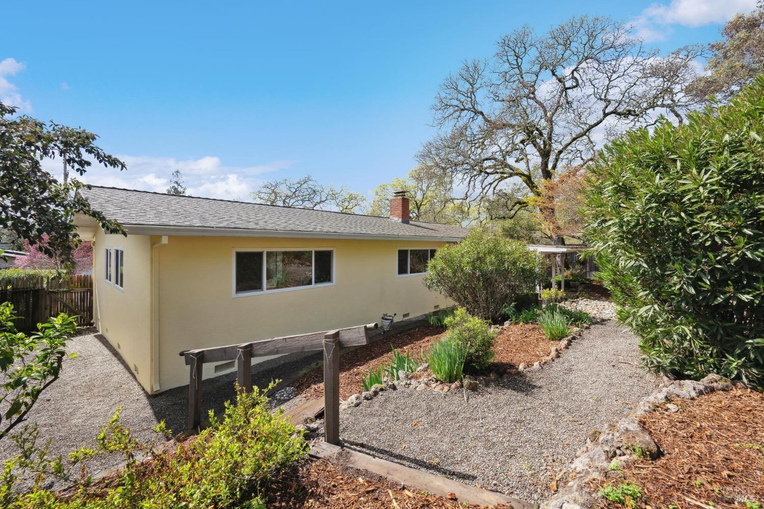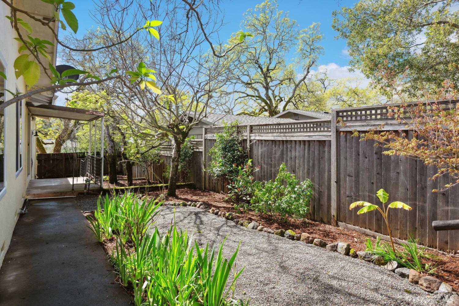 Located on a quiet lane just north of the bike patch, the dedicated open space of the Montini Preserve and Overlook Trail, this charming vintage 3 bedroom/2 bath home shows pride of ownership inside and out. Updated with fresh paint inside and out, dual pane windows, newer roof, and a tasteful refresh on the landscaping. The backyard is a quiet and private wonderland complete with extensive plans for a new swimming pool but wonderful just as it is now with mature landscaping and bursts of color in all directions. Backing to a large 1800's estate built for one of General Vallejo's daughters and later owned by Steve Silver, founder of the iconic Beach Blanket Babylon. The backyard is private with no homes looking in and it feels like you back to a park. Interior features include hardwood floors (even under the brand new carpet in the living room), flagstone wood burning fireplace, indoor laundry, wonderful natural light, generous sized rooms, and sliders from several rooms leading to the stunning grounds. Enjoy dining al fresco under the stars with the charming bistro lights. Feel like you are on vacation at home and walk to the Plaza on the bike path cutting through dedicated open spaces. The charm of a vintage home, the convenience of recent upgrades, and a prime location.
